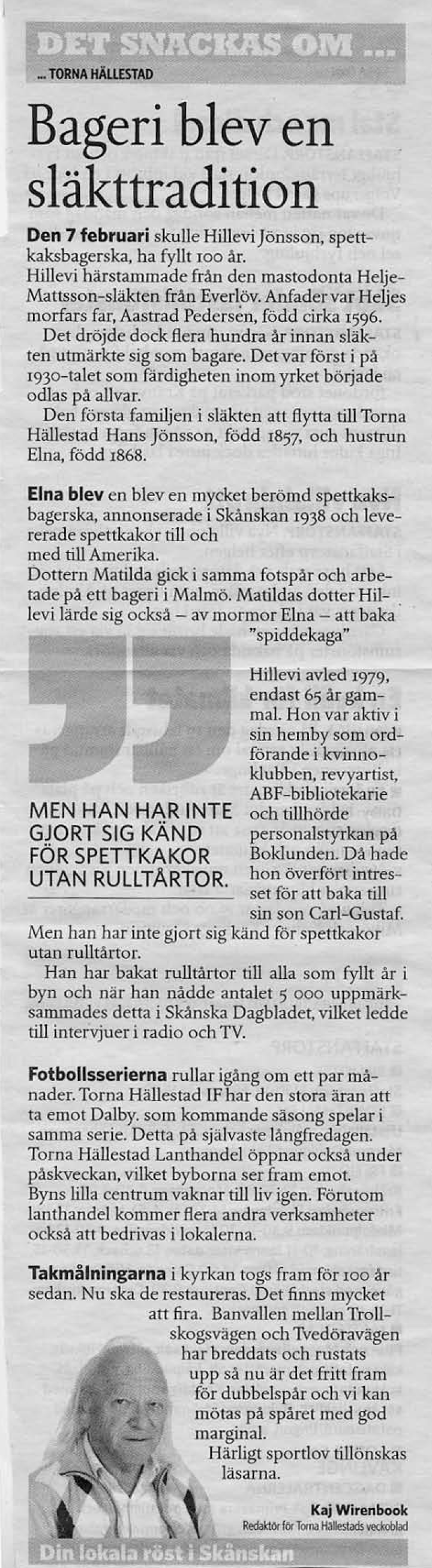18 februari 2014 publicerade Kaj Wirenbook en text om Hillevi och Carl-Gustaf Jönsson, släktens egna spiddekagsbagare.