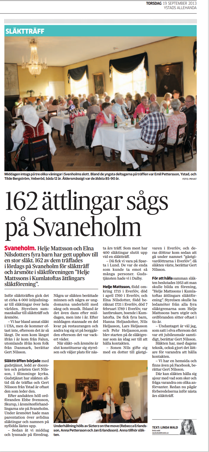 2013 hölls släkträffen i ett vackert omgivet Svaneholm och Ystad Allehanda förevigade kvällen med bl a 162 medlemmars uppslutning.